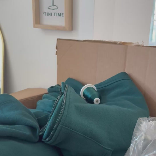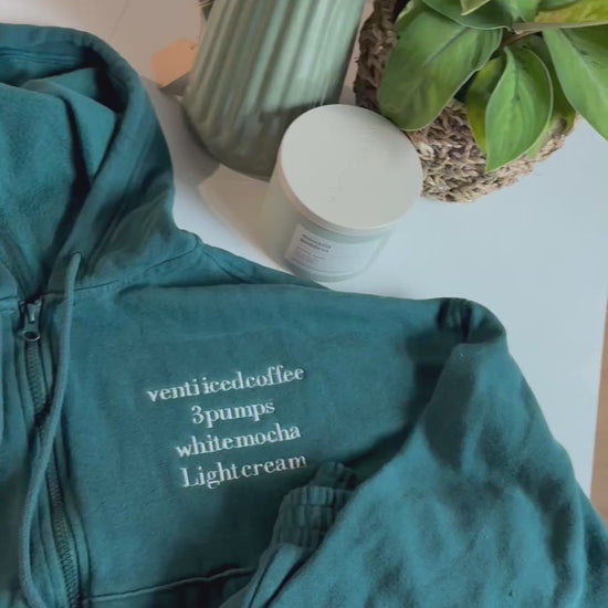 Imagine a cozy sweatsuit set in a rich emerald green hue. Your customizable coffee Order in beautifully embroidered cream thread color. The top features a relaxed fit hoodie with a drawstring, perfect for a laid-back coffee run or a chill day at home. The sleeves are slightly oversized, adding a trendy touch, while the soft, brushed fabric promises comfort against the skin. The matching sweatpants have a wide leg bottom and a cute little iced coffee decal on the side. Together, this set embodies a luxurious yet casual vibe, ideal for sipping your favorite brew in style.