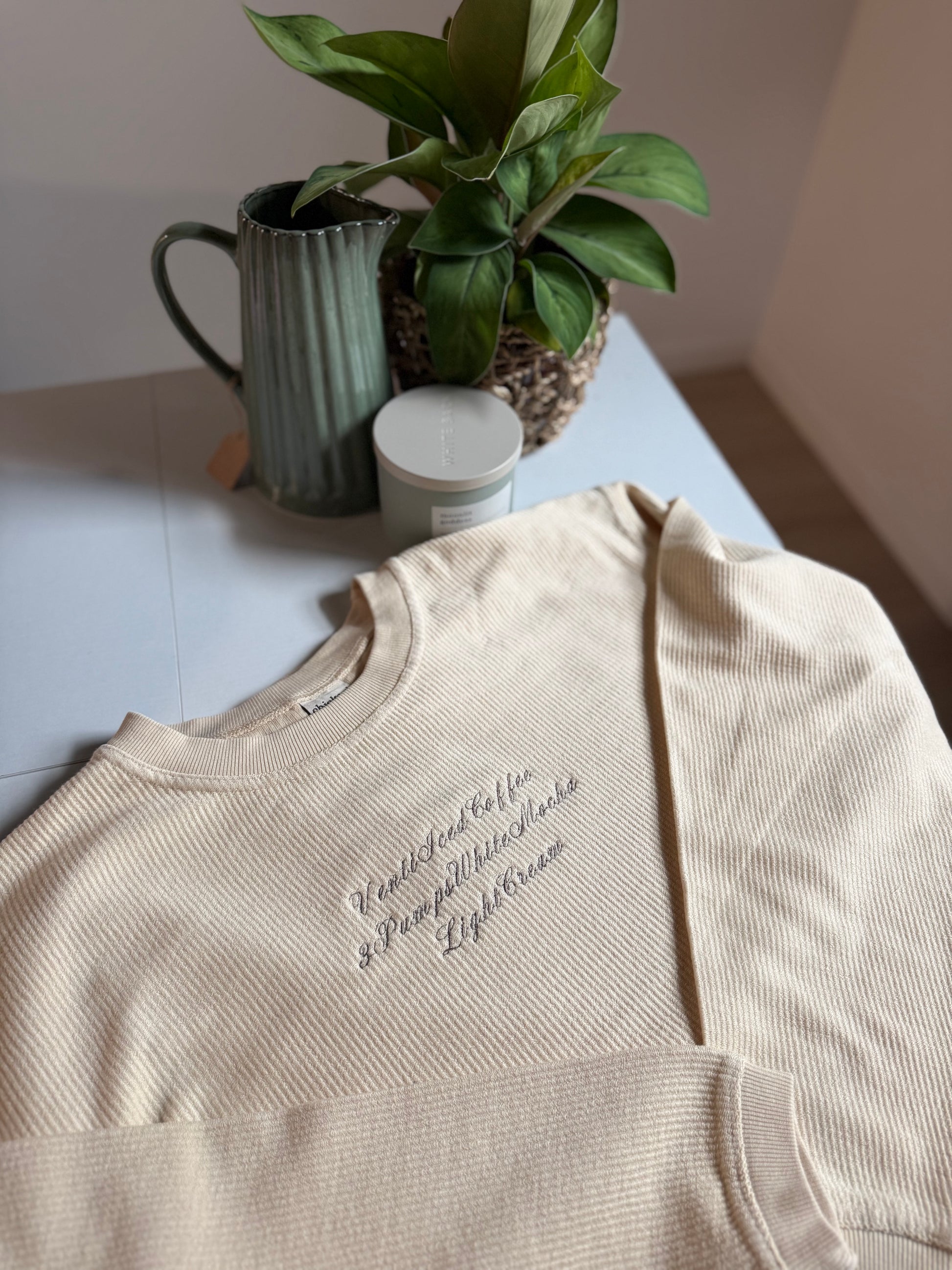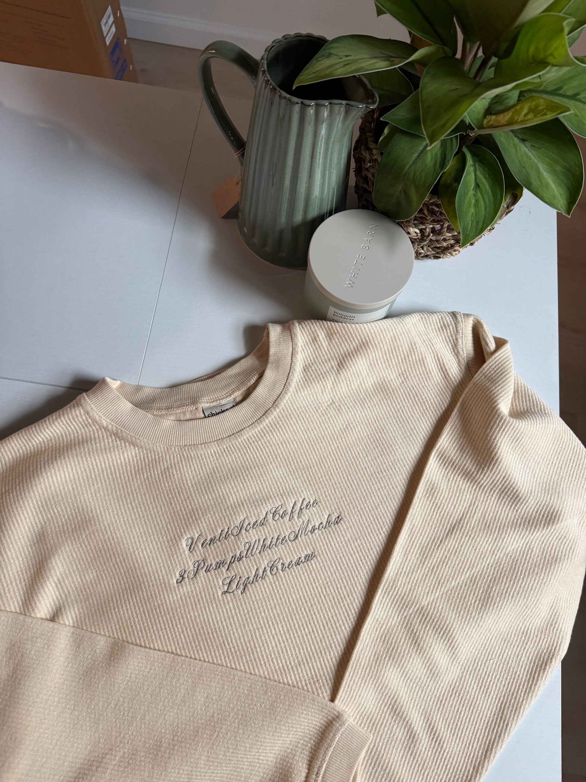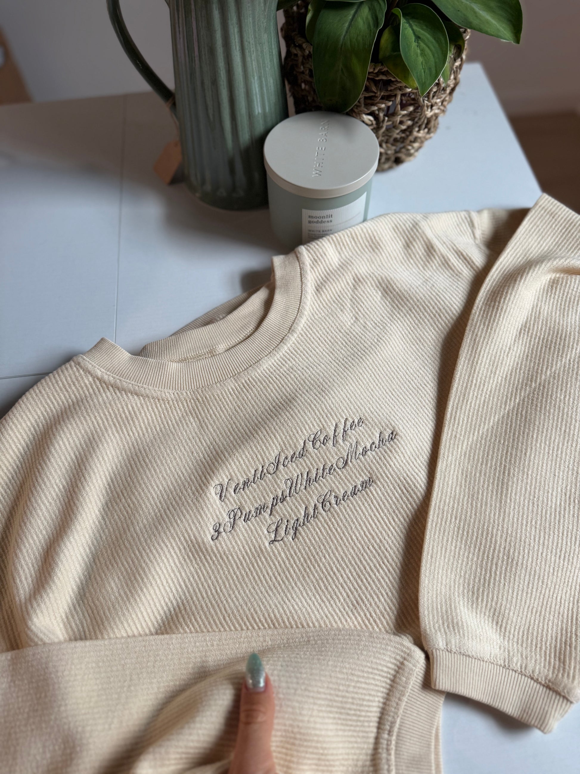 The standout feature is an intricately embroidered coffee order, showcasing your favorite drink—perhaps a cappuccino or a caramel macchiato—stitched in a playful, stylish font. The sweatshirt is available in a range of earthy tones, giving it a laid-back vibe that pairs well with jeans or leggings. It's the ideal blend of comfort and personality for any coffee lover.☕️🤍🍁🍂